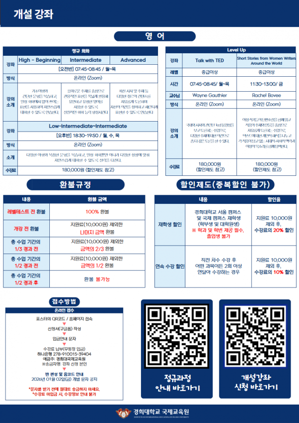 - 정규 등록기간 : 2026.04.13.(월) ~ 2026.04.29.(수) 17:00까지